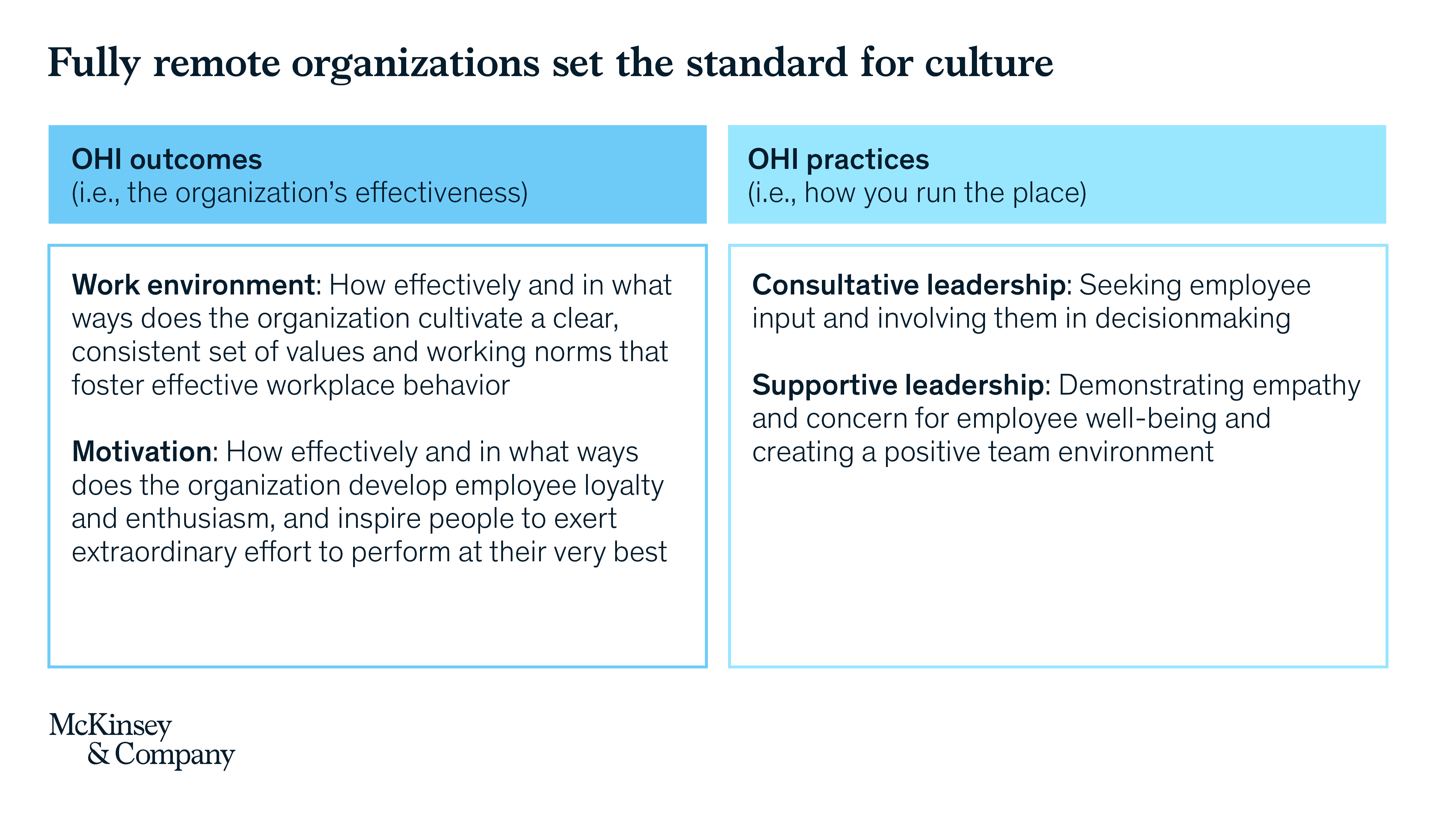 There are also similarities in these organizations’ cultural profiles, notably top-decile scores on OHI outcomes for Work Environment and Motivation. They share common leadership styles with top-decile performance on Consultative Leadership and Supportive Leadership OHI practices as well.