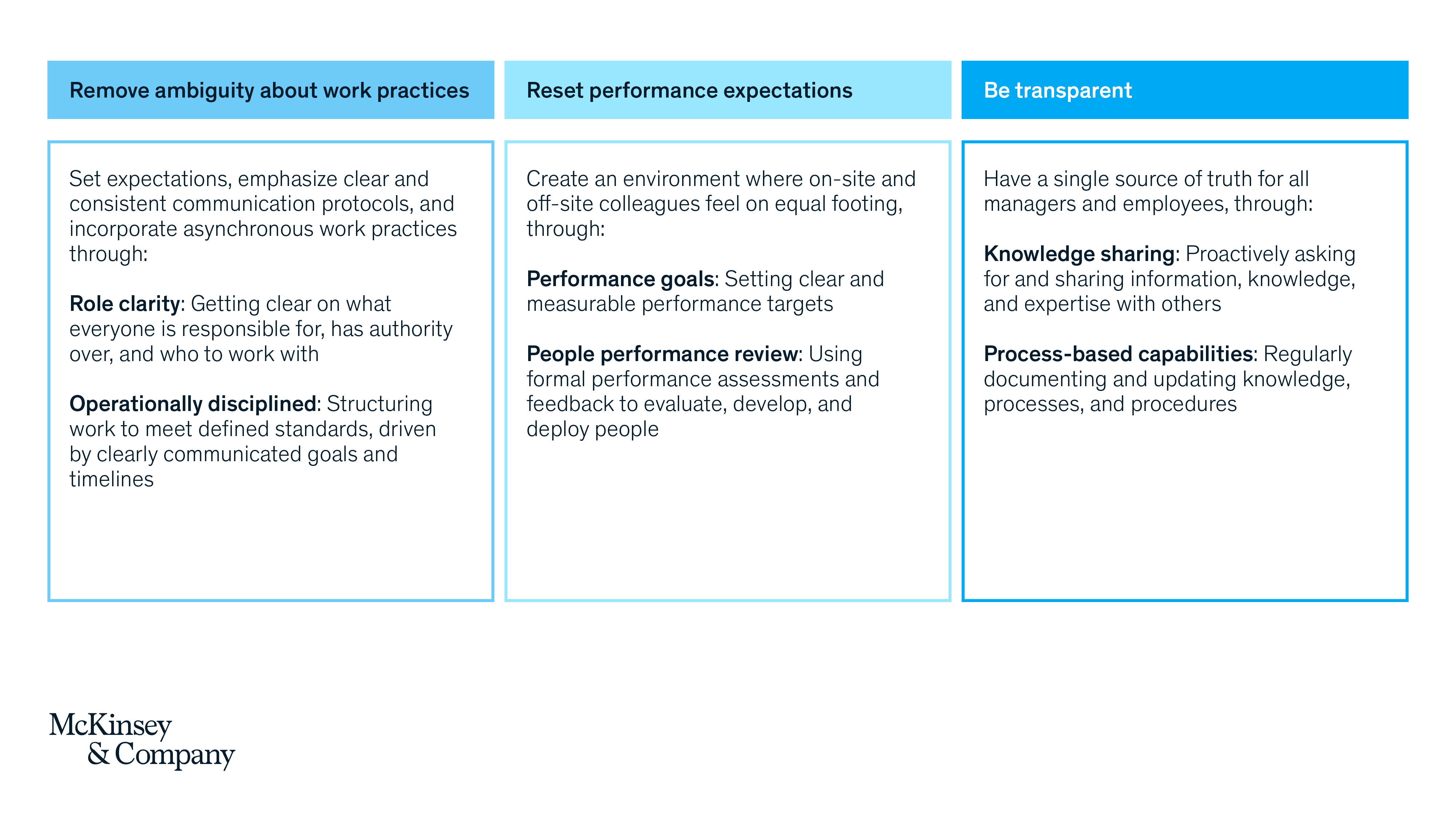 - Be transparent. Have a single source of truth for all managers and employees (e.g., a regularly updated handbook that lays out the rules and norms), through knowledge sharing and process-based capabilities.