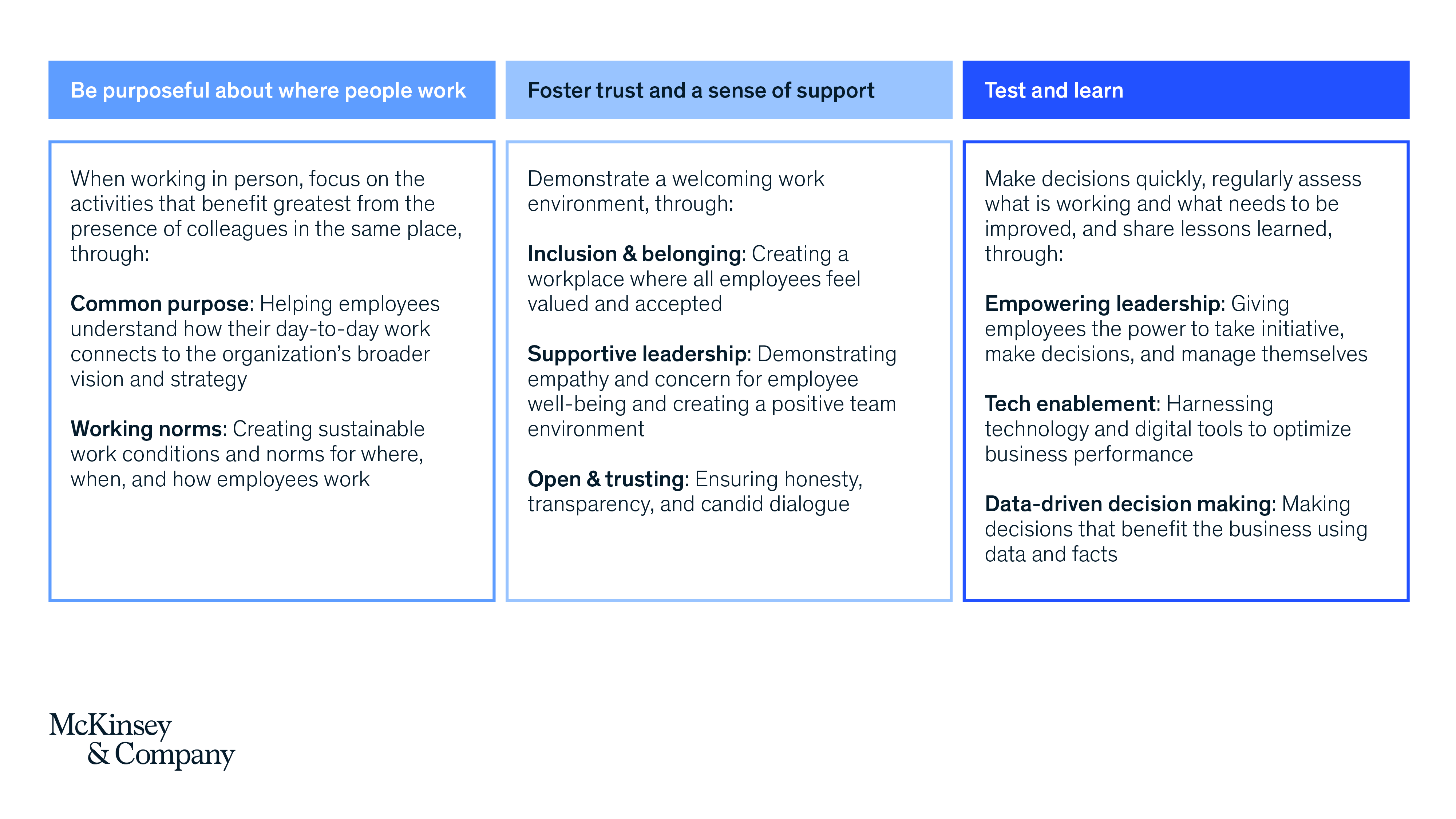 - Test and learn. Make decisions quickly, regularly assess what is working and what needs to be improved, and share lessons learned—even the failures—through empowering leadership, tech enablement, and data-driven decision making.