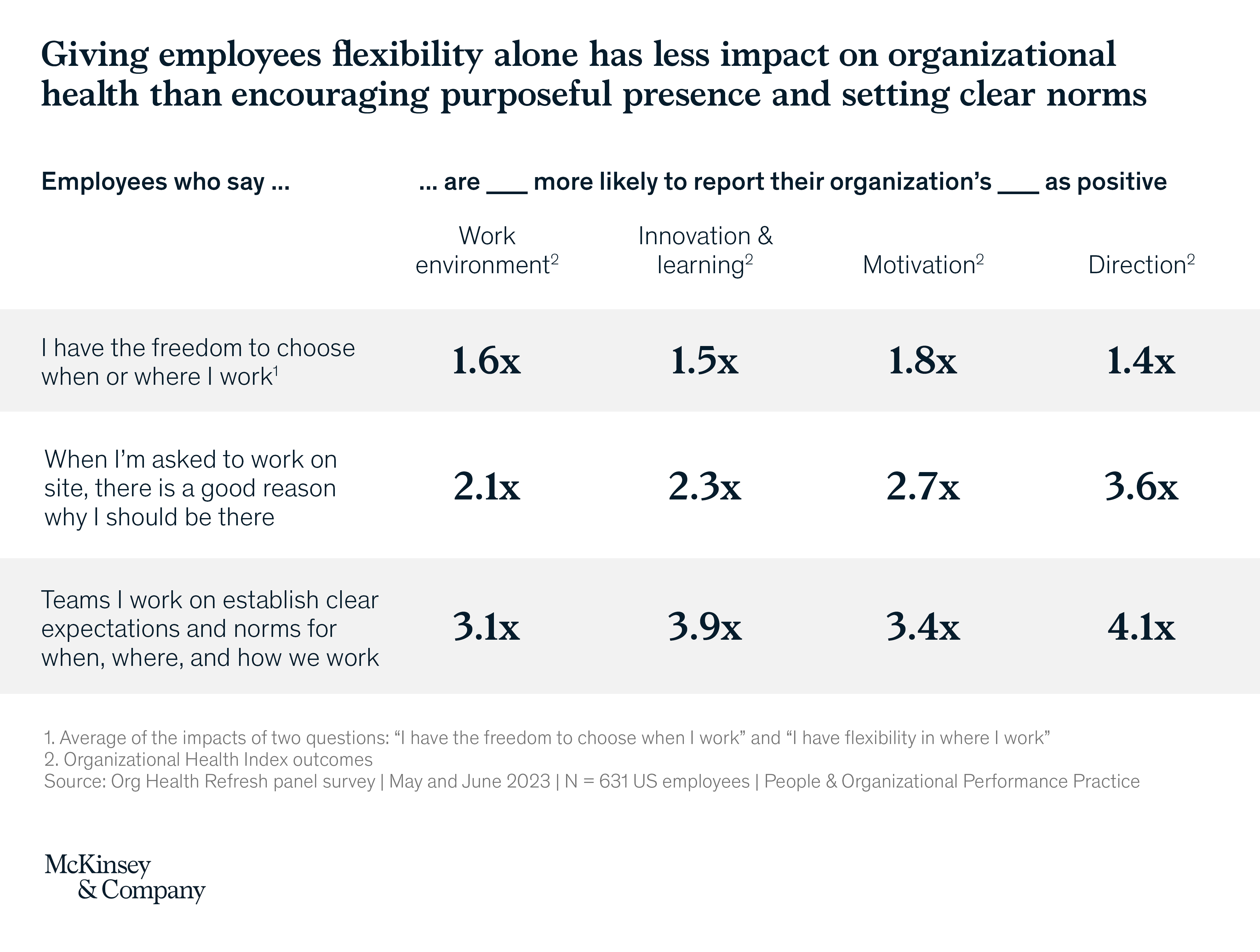 We look forward to continuing to test the boundaries of how organizational health is impacted by workplace flexibility, experience, and the relationship to resilience of today’s organizations. To learn more about the OHI refresh, read our article, “Organizational health is (still) the key to long-term performance.”